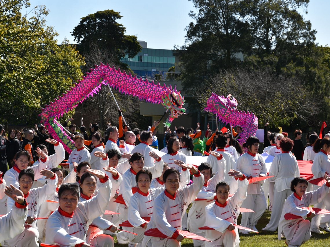 Our lions and dragon joined hundreds of performers at Box Gardens on the weekend for a TV film shoot for China TV Phoenix. There were various dance groups in colourful costumes with Tai Chi and Wushu practitioners all performing in unison. After about three rehearsals, the taping went well with two takes. It was a lot of fun on a beautiful sunny day!